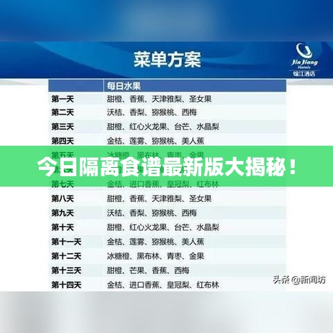 这就是今日隔离食谱最新版,希望这份食谱能帮助您在隔离期间保持良好的心态和身体健康,在隔离期间,我们要注重饮食的均衡和多样性,保持良好的生活习惯,共同度过这个特殊时期。